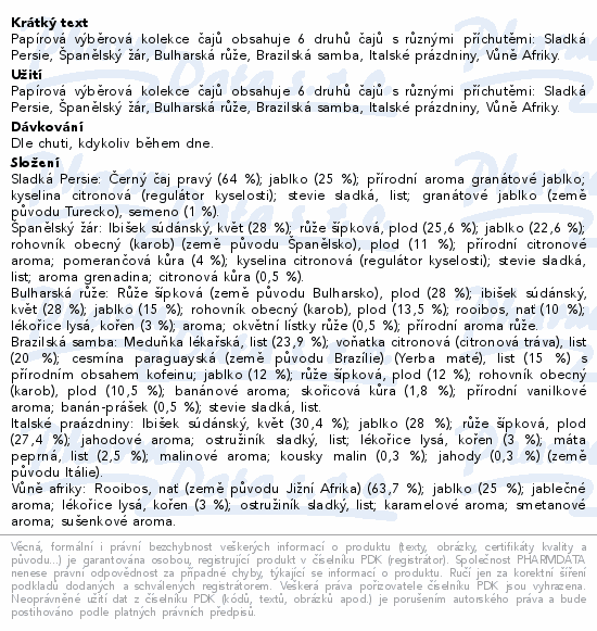 Papírová výběrová kolekce čajů obsahuje 6 druhů čajů s různými příchutěmi: Sladká Persie, Španělský žár, Bulharská růže, Brazilská samba, Italské prázdniny, Vůně Afriky.