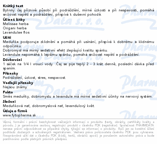 Bylinný čaj příznivě působí při podráždění, mírné úzkosti a při nespavosti, pomáhá snižovat napětí a podráždění, přispívá k duševní pohodě.