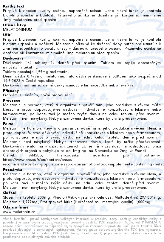 Přispívá k zlepšení kvality spánku, napomáhá usínání. Jeho hlavní funkcí je kontrola biorytmu spánku a bdělosti. Příznivého účinku se dosáhne při konzumaci minimálně 1mg melatoninu před spaním.