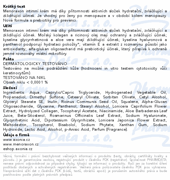 Menoraxon intimní krém má díky přítomnosti aktivních složek hydratační, zvláčňující a zklidňující účinek. Je vhodný pro ženy po menopauze a v období kolem menopauzy. Nová formula s prebiotiky pro prevenci.