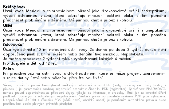 Ústní voda Meridol s chlorhexidinem působí jako širokospektré orální antiseptikum, vytváří ochrannou vrstvu, která zabraňuje množení bakterií plaku a tím pomáhá předcházet problémům s dásněmi. Má jemnou chuť a je bez alkoholu.