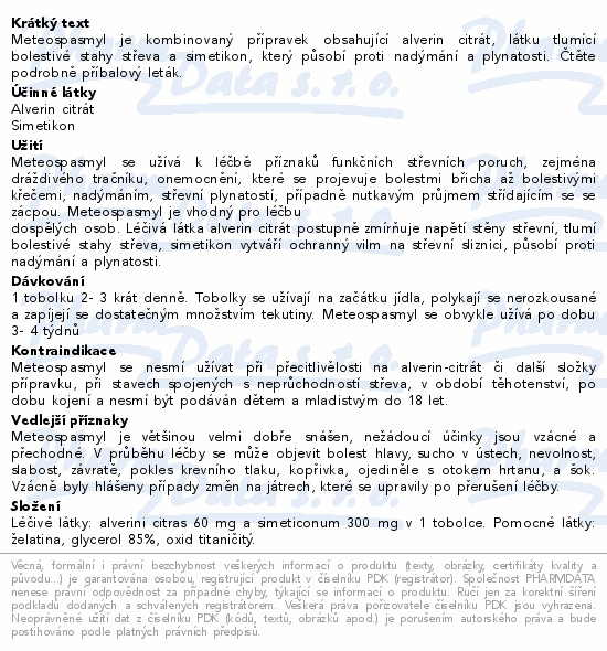 Meteospasmyl je kombinovaný přípravek obsahující alverin citrát, látku tlumící bolestivé stahy střeva a simetikon, který působí proti nadýmání a plynatosti. Čtěte pozorně příbalový leták.