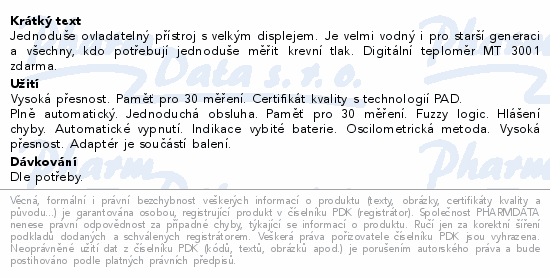 Jednoduše ovladatelný přístroj s velkým displejem. Je velmi vodný i pro starší generaci a všechny, kdo potřebují jednoduše měřit krevní tlak. Digitální teploměr MT 3001 zdarma.