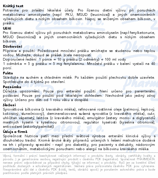 Potravina pro zvláštní lékařské účely. Pro řízenou dietní výživu při poruchách metabolismu aminokyselin (např. PKU, MSUD (leucinóza)) a jiných onemocněních vyžadujících dietu s nízkým obsahem bílkovin. Nápoj se sníženým obsahem bílkovin, v prášku.