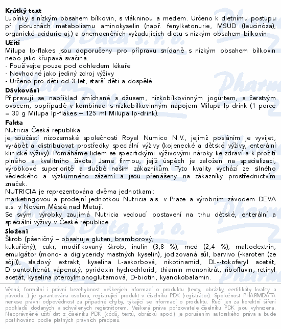 Lupínky s nízkým obsahem bílkovin, s vlákninou a medem. Určeno k dietnímu postupu při poruchách metabolismu aminokyselin (např. fenylketonurie, MSUD (leucinóza), organické acidurie aj.) a onemocněních vyžadujících dietu s nízkým obsahem bílkovin.