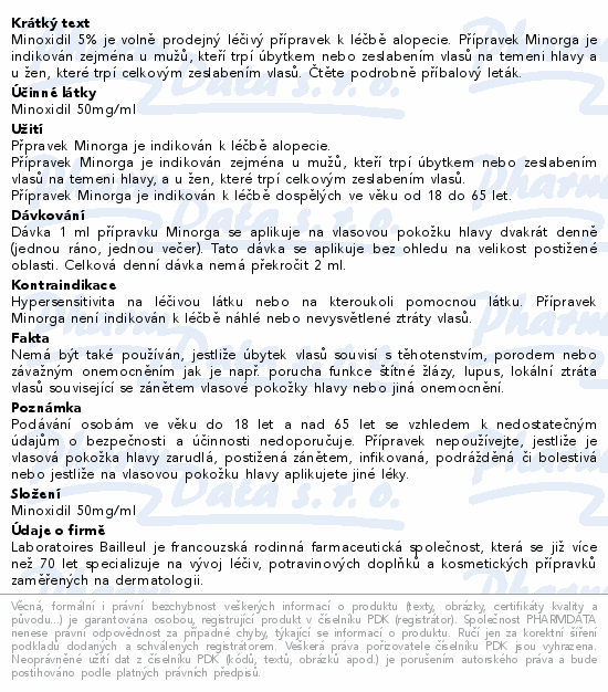 Přípravek Minorga, kožní roztok, je volně prodejný léčivý přípravek, indikován k léčbě alopecie u mužů a žen. Přípravek Minorga je určen k použití u dospělých ve věku od 18 do 65 let trpících postupným zeslabením nebo ztrátou vlasů na temeni hlavy. Přípravek Minorga je indikován zejména u mužů, kteří trpí úbytkem nebo zeslabením vlasů na temeni hlavy, a u žen, které trpí celkovým zeslabením vlasů. Přípravek je určen ke kontinuální léčbě.