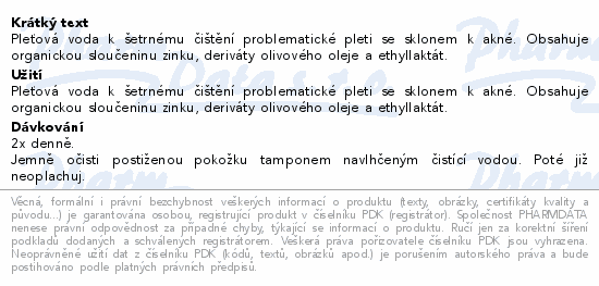 Pleťová voda k šetrnému čištění problematické pleti se sklonem k akné. Obsahuje organickou sloučeninu zinku, deriváty olivového oleje a ethyllaktát.