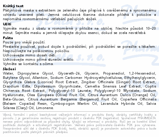 Plátýnková maska s extraktem ze zeleného čaje přispívá k osvěženému a vyrovnanému vzhledu unavené pleti. Jemná celulózová tkanina dokonale přiléhá k pokožce a napomáhá rovnoměrnému vstřebání pečujících složek.