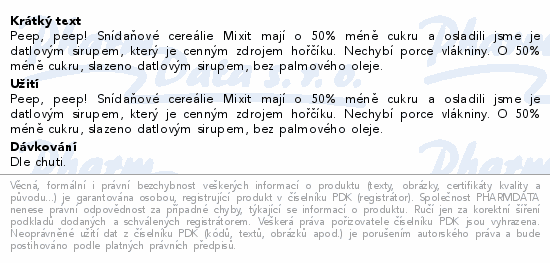 Peep, peep! Snídaňové cereálie Mixit mají o 50% méně cukru a osladili jsme je datlovým sirupem, který je cenným zdrojem hořčíku. Nechybí porce vlákniny. O 50% méně cukru, slazeno datlovým sirupem, bez palmového oleje.
