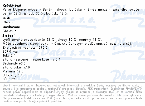 Velké křupavé ovoce - Banán, jahoda, borůvka - Směs mrazem sušeného ovoce - banán 58 %, jahody 30 %, borůvky 12 %.