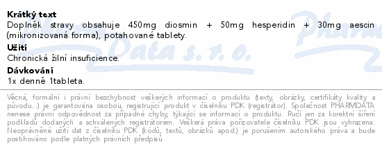 Doplněk stravy obsahuje 450mg diosmin + 50mg hesperidin + 30mg aescin (mikronizovaná forma), potahované tablety.