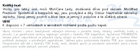 Vložky pro lehký únik moči MoliCare Lady, dodávané dříve pod názvem MoliMed Premium. Spolehlivě a bezpečně sají, jsou prodyšné a díky Odour Neutralizér zabraňují zápachu. Nový jemný povrch s Aloe Vera je jemný k pokožce a ta zůstává zdravá.