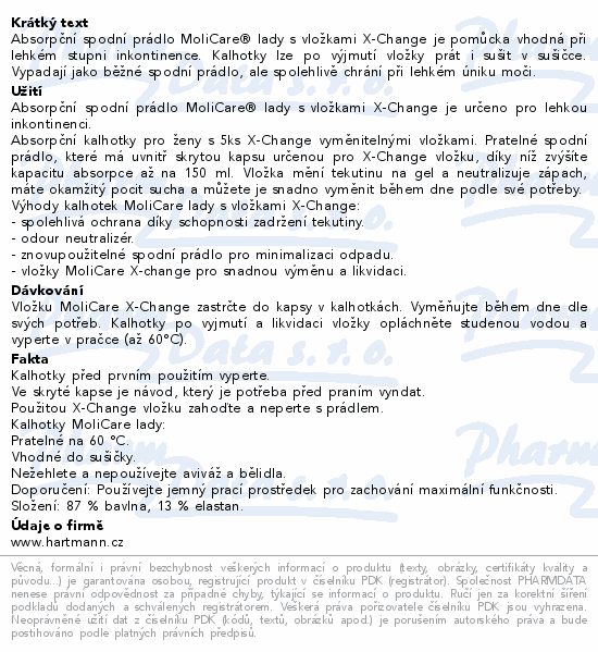 Absorpční spodní prádlo MoliCare® lady s vložkami X-Change je pomůcka vhodná při lehkém stupni inkontinence. Kalhotky lze po výjmutí vložky prát i sušit v sušičce. Vypadají jako běžné spodní prádlo, ale spolehlivě chrání při lehkém úniku moči.