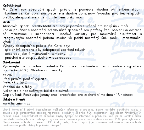 MoliCare lady absorpční spodní prádlo je pomůcka vhodná při lehkém stupni inkontinence. Kalhotky jsou pratelné a vhodné do sušičky. Vypadají jako běžné spodní prádlo, ale spolehlivě chrání při lehkém úniku moči.