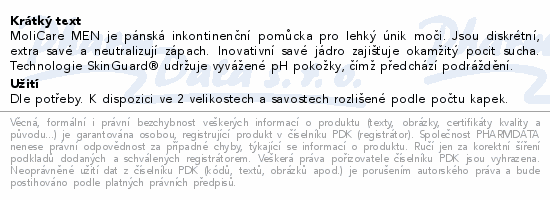 MoliCare MEN je pánská inkontinenční pomůcka pro lehký únik moči. Jsou diskrétní, extra savé a neutralizují zápach. Inovativní savé jádro zajišťuje okamžitý pocit sucha. Technologie SkinGuard® udržuje vyvážené pH pokožky, čímž předchází podráždění.