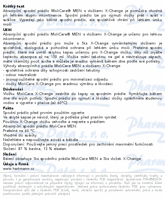 Absorpční spodní prádlo MoliCare® MEN s vložkami X-Change je pomůcka vhodná při lehkém stupni inkontinence. Spodní prádlo lze po výjmutí vložky prát i sušit v sušičce. Vypadají jako běžné spodní prádlo, ale spolehlivě chrání při lehkém úniku moči.