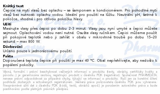 Mycí čepice MoliCare® Skin je impregnovaná šamponem a kondicionérem. Umývá vlasy rychle, jemně a pohodlně bez použití vody (vlasy není zapotřebí oplachovat), a je tak ideální pomůckou pro hygienu přímo na lůžku, nebo tam, kde nemáte přístup k vodě. Neutrální pH šetrné k pokožce je vhodné i pro citlivou pokožku hlavy. Pro ještě příjemnější pocit je možné čepici nahřát v mikrovlnné troubě.