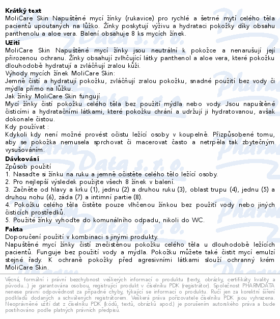 MoliCare Skin Napuštěné mycí žínky (rukavice) pro rychlé a šetrné mytí celého těla pacientů upoutaných na lůžko. Žínky poskytují výživu a hydrataci pokožky díky obsahu panthenolu a aloe vera. Balení obsahuje 8 ks mycích žínek.