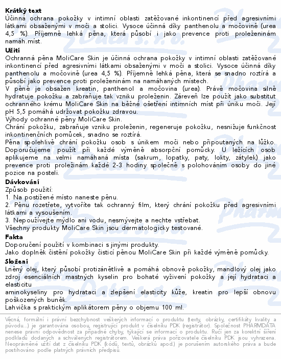 Ochranná pěna MoliCare® Skin účinně chrání pokožku zatěžovanou inkontinencí, nejen v intimní oblasti, před agresivními látkami obsaženými v moči a stolici. Je vysoce účinná díky panthenolu a močovině (urea 4,5 %), příjemně lehká a snadno roztíratelná. Působí také jako prevence proti proleženinám na namáhaných místech. Aplikujte množství o velikosti vlašského ořechu, jedno balení vydrží zhruba 150 použití.