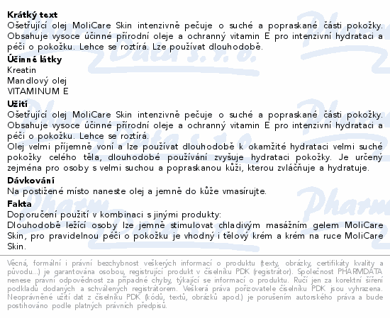 Ošetřující olej MoliCare Skin intenzivně pečuje o suché a popraskané části pokožky. Obsahuje vysoce účinné přírodní oleje a ochranný vitamin E pro intenzivní hydrataci a péči o pokožku. Lehce se roztírá. Lze používat dlouhodobě.