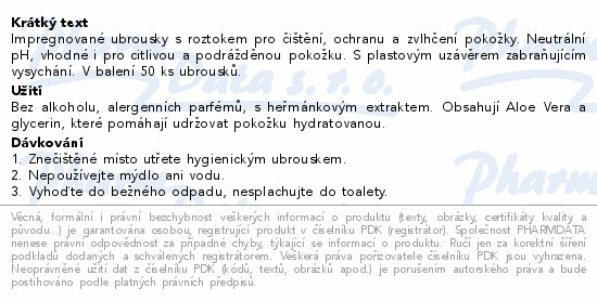 Impregnované ubrousky s roztokem pro čištění, ochranu a zvlhčení pokožky. Neutrální pH, vhodné i pro citlivou a podrážděnou pokožku. S plastovým uzávěrem zabraňujícím vysychání. V balení 50 ks ubrousků.