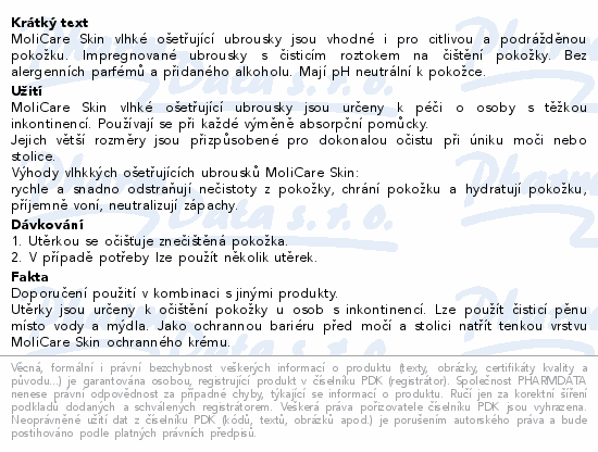 MoliCare Skin vlhké ošetřující ubrousky jsou vhodné i pro citlivou a podrážděnou pokožku. Impregnované ubrousky s čisticím roztokem na čištění pokožky. Bez alergenních parfémů a přidaného alkoholu. Mají pH neutrální k pokožce.