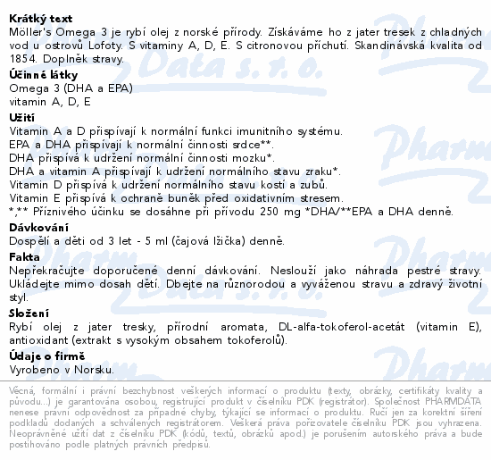 Möller's Omega 3 je rybí olej z norské přírody. Získáváme ho z jater tresek z chladných vod u ostrovů Lofoty. S vitaminy A, D, E. S citronovou příchutí. Skandinávská kvalita od 1854. Doplněk stravy.