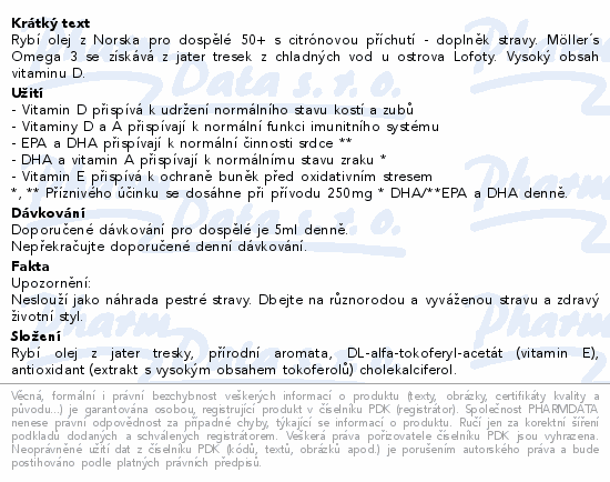 Mollers Omega 3 50plus je doplněk stravy, který obsahuje rybí olej z tresčích jater z Norska, pro dospělé nad 50 let, s vysokým obsahem vitaminu D, s citronovou příchutí.