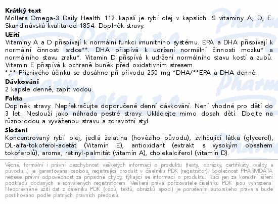 Möllers Omega-3 Daily Health 112 kapslí je rybí olej v kapslích. S vitaminy A, D, E. Skandinávská kvalita od 1854. Doplněk stravy.