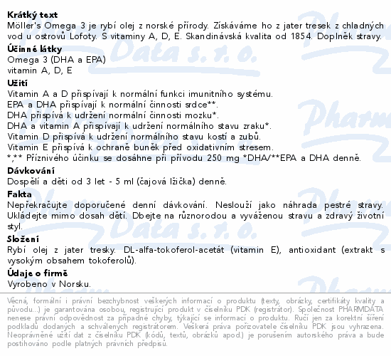Mollers Omega 3 Natur je doplněk stravy, který obsahuje rybí tuk bez příchuti vyrobený přímo v Norsku, je vyroben z tresčích jater nejvyšší kvality s vysokým obsahem omega 3 mastných kyselin a vitamínů D, A a E. Tento olej poskytuje v přirozené nekoncentrované snadno vstřebatelné formě triglyceridů 1,2 g omega-3 v denní doporučené dávce.