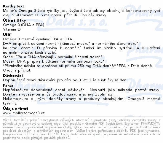 Möller's Omega 3 želé rybičky jsou žvýkací želé tablety obsahující koncentrovaný rybí olej. S vitaminem D. S malinovou příchutí. Doplněk stravy.