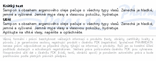 Šampon s obsahem arganového oleje pečuje o všechny typy vlasů. Zanechá je hladké, jemné a vyživené. Jemně myje vlasy a vlasovou pokožku, hydratuje.