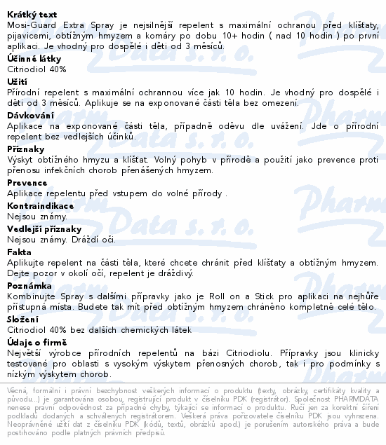 Mosi-Guard Extra Spray je nejsilnější repelent s maximální ochranou před klíšťaty, pijavicemi, obtížným hmyzem a komáry po dobu 10+ hodin ( nad 10 hodin ) po první aplikaci. Je vhodný pro dospělé i děti od 3 měsíců.