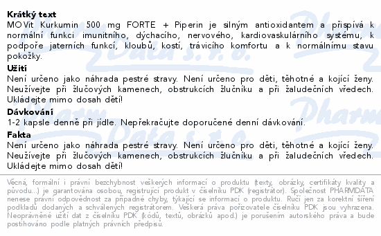 MOVit Kurkumin 500 mg FORTE + Piperin je silným antioxidantem a přispívá k normální funkci imunitního, dýchacího, nervového, kardiovaskulárního systému, k podpoře jaterních funkcí, kloubů, kostí, trávicího komfortu a k normálnímu stavu pokožky.