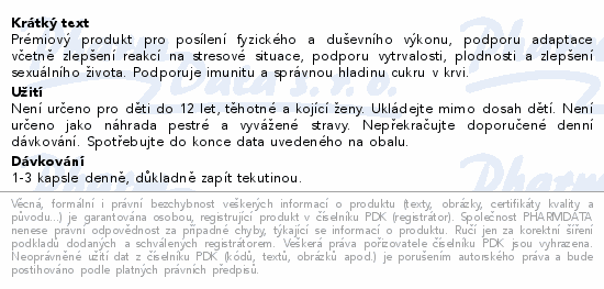 Prémiový produkt pro posílení fyzického a duševního výkonu, podporu adaptace včetně zlepšení reakcí na stresové situace, podporu vytrvalosti, plodnosti a zlepšení sexuálního života. Podporuje imunitu a správnou hladinu cukru v krvi.