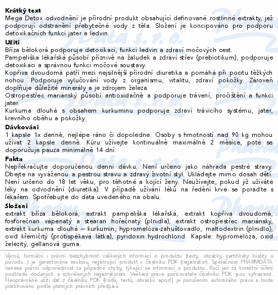 Mega Detox odvodnění je přírodní produkt obsahující definované rostlinné extrakty, jež podporují odstranění přebytečné vody z těla. Složení je koncipováno pro podporu detoxikačních funkcí jater a ledvin.