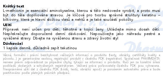 L-methionin je esenciální aminokyselina, kterou si tělo nedovede vyrobit, a proto musí být do těla doplňována stravou. Je klíčová pro tvorbu správné struktury keratinu – bílkoviny, která je hlavní složkou vlasů a nehtů a je také součástí pokožky.