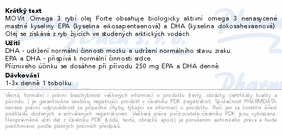 MOVit Omega 3 rybí olej Forte obsahuje biologicky aktivní omega 3 nenasycené mastné kyseliny EPA (kyselina eikosapentaenová) a DHA (kyselina dokosahexaenová). Olej se získává z ryb žijících ve studených arktických vodách.