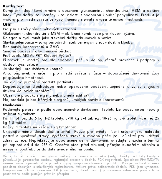 Komplexní doplňkové krmivo s obsahem glukosaminu, chondroitinu, MSM a dalších látek. Tyto složky jsou ceněny v souvislosti s podporou kloubní pohyblivosti. Produkt je vhodný pro mladá zvířata ve vývoji, seniory i zvířata s vyšší tělesnou hmotností.