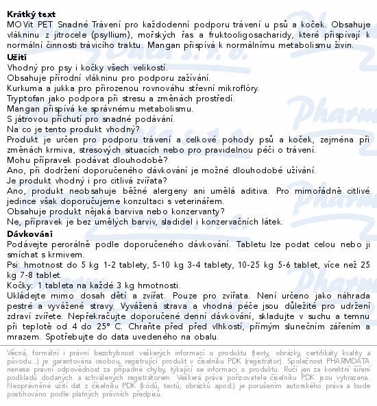 MOVit PET Snadné Trávení pro každodenní podporu trávení u psů a koček. Obsahuje vlákninu z jitrocele (psyllium), mořských řas a fruktooligosacharidy, které přispívají k normální činnosti trávicího traktu. Mangan přispívá k normálnímu metabolismu živin.