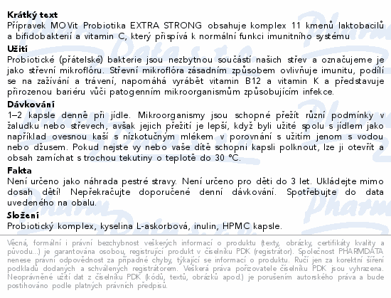 Přípravek MOVit Probiotika EXTRA STRONG obsahuje komplex 11 kmenů laktobacilů a bifidobakterií a vitamin C, který přispívá k normální funkci imunitního systému