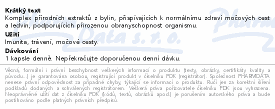 Komplex přírodních extraktů z bylin, přispívajících k normálnímu zdraví močových cest a ledvin, podporujících přirozenou obranyschopnost organismu.