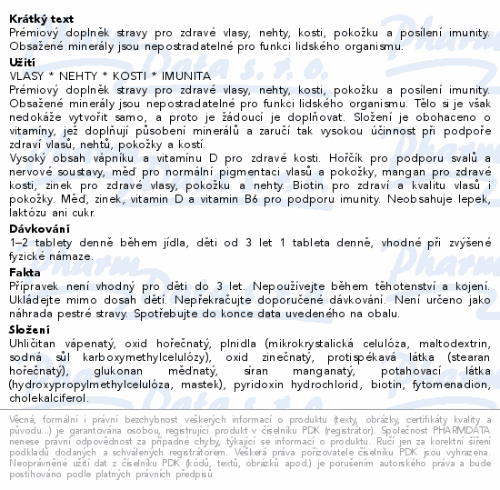 Prémiový doplněk stravy pro zdravé vlasy, nehty, kosti, pokožku a posílení imunity. Obsažené minerály jsou nepostradatelné pro funkci lidského organismu.