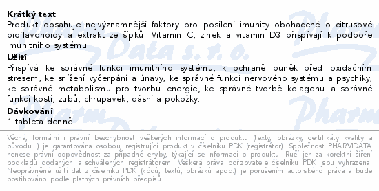 Produkt obsahuje nejvýznamnější faktory pro posílení imunity obohacené o citrusové bioflavonoidy a extrakt ze šípků. Vitamin C, zinek a vitamin D3 přispívají k podpoře imunitního systému.
