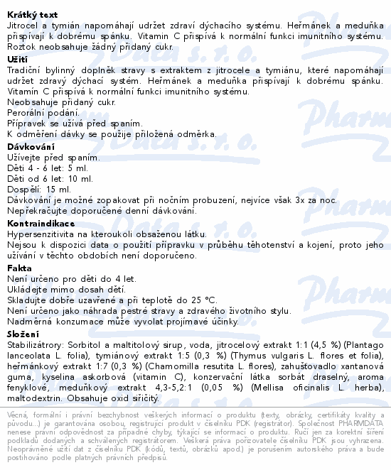 Jitrocel a tymián napomáhají udržet zdraví dýchacího systému. Heřmánek a meduňka přispívají k dobrému spánku. Vitamin C přispívá k normální funkci imunitního systému. Roztok neobsahuje žádný přidaný cukr.