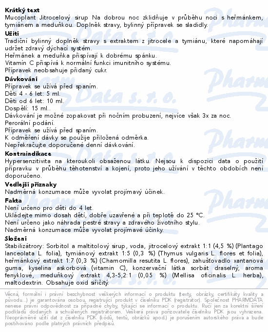 Mucoplant Jitrocelový sirup Na dobrou noc zklidňuje v průběhu noci s heřmánkem, tymiánem a meduňkou. Doplněk stravy, bylinný přípravek se sladidly.