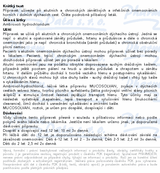| Farmako-terapeutická skupina, účinné látky: | RESPIRAČNÍ SYSTÉM -> LÉČIVA PROTI NACHLAZENÍ A KAŠLI -> EXPEKTORANCIA, KROMĚ KOMBINACÍ S ANTITUSIKY -> MUKOLYTIKA -> AMBROXOL |