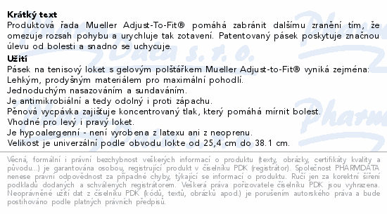Produktová řada Mueller Adjust-To-Fit® pomáhá zabránit dalšímu zranění tím, že omezuje rozsah pohybu a urychluje tak zotavení. Patentovaný pásek poskytuje značnou úlevu od bolesti a snadno se uchycuje.