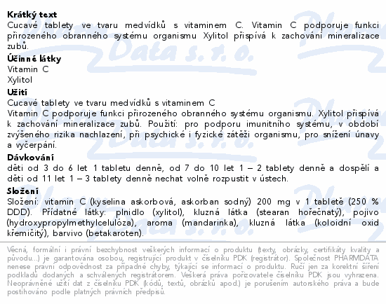Cucavé tablety ve tvaru medvídků s vitaminem C. Vitamin C podporuje funkci přirozeného obranného systému organismu Xylitol přispívá k zachování mineralizace zubů.
