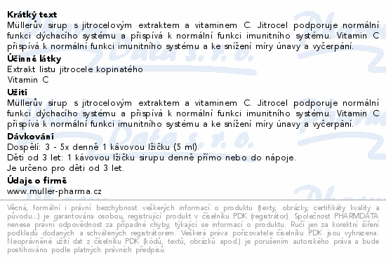 Müllerův sirup s jitrocelovým extraktem a vitaminem C. Jitrocel podporuje normální funkci dýchacího systému a přispívá k normální funkci imunitního systému. Vitamin C přispívá k normální funkci imunitního systému a ke snížení míry únavy a vyčerpání.